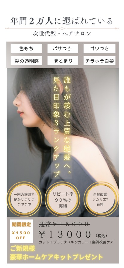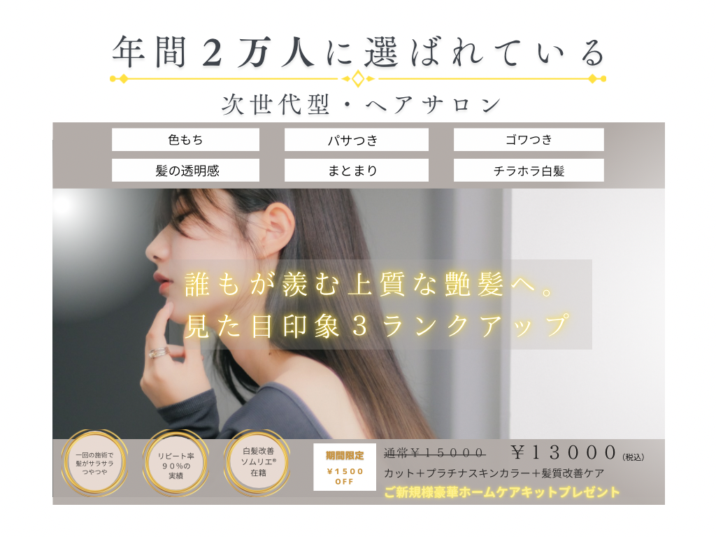 そして髪の老化、ダメージにつながっていきます。白髪を改善するエビデンスを用いた希少なケア商材を使いながら白髪改善していきます。新しい形の髪質改善ケアです。こちらも継続していくと効果を更に実感できます。